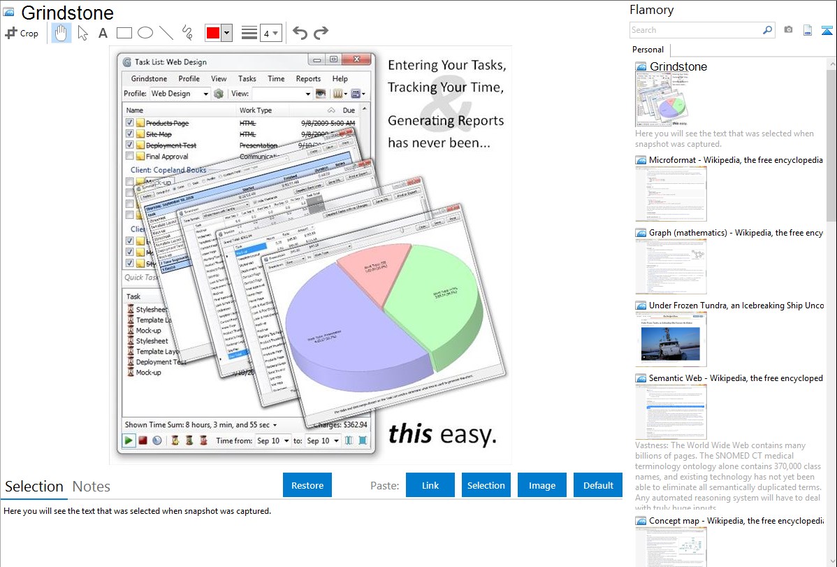 Flamory helps you capture and store screenshots from Grindstone by pressing a single hotkey. It will be saved to a history, so you can continue doing your tasks without interruptions. Later, you can edit the screenshot: crop, resize, add labels and highlights. After that, you can paste the screenshot into any other document or e-mail message.