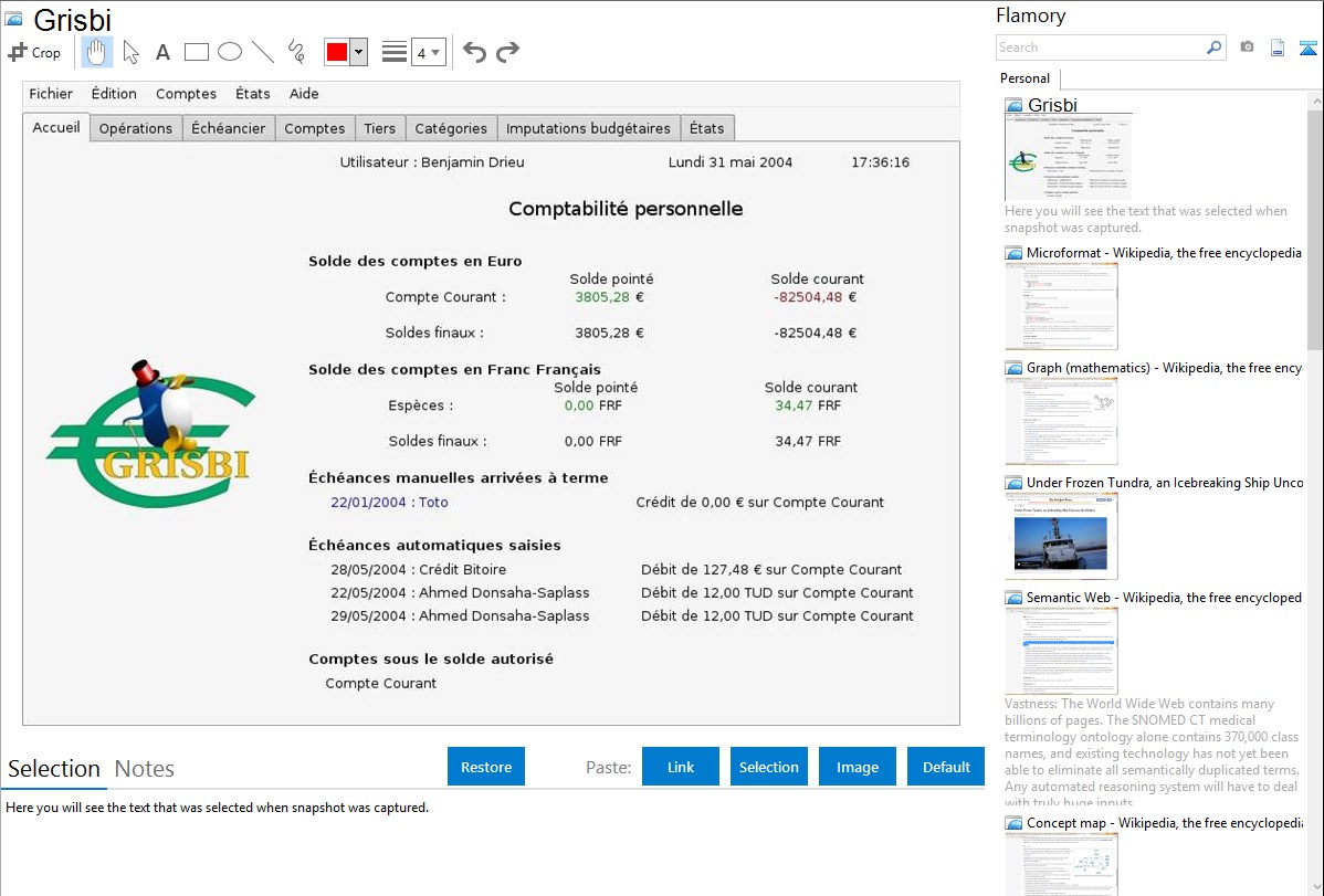 Flamory helps you capture and store screenshots from Grisbi by pressing a single hotkey. It will be saved to a history, so you can continue doing your tasks without interruptions. Later, you can edit the screenshot: crop, resize, add labels and highlights. After that, you can paste the screenshot into any other document or e-mail message.