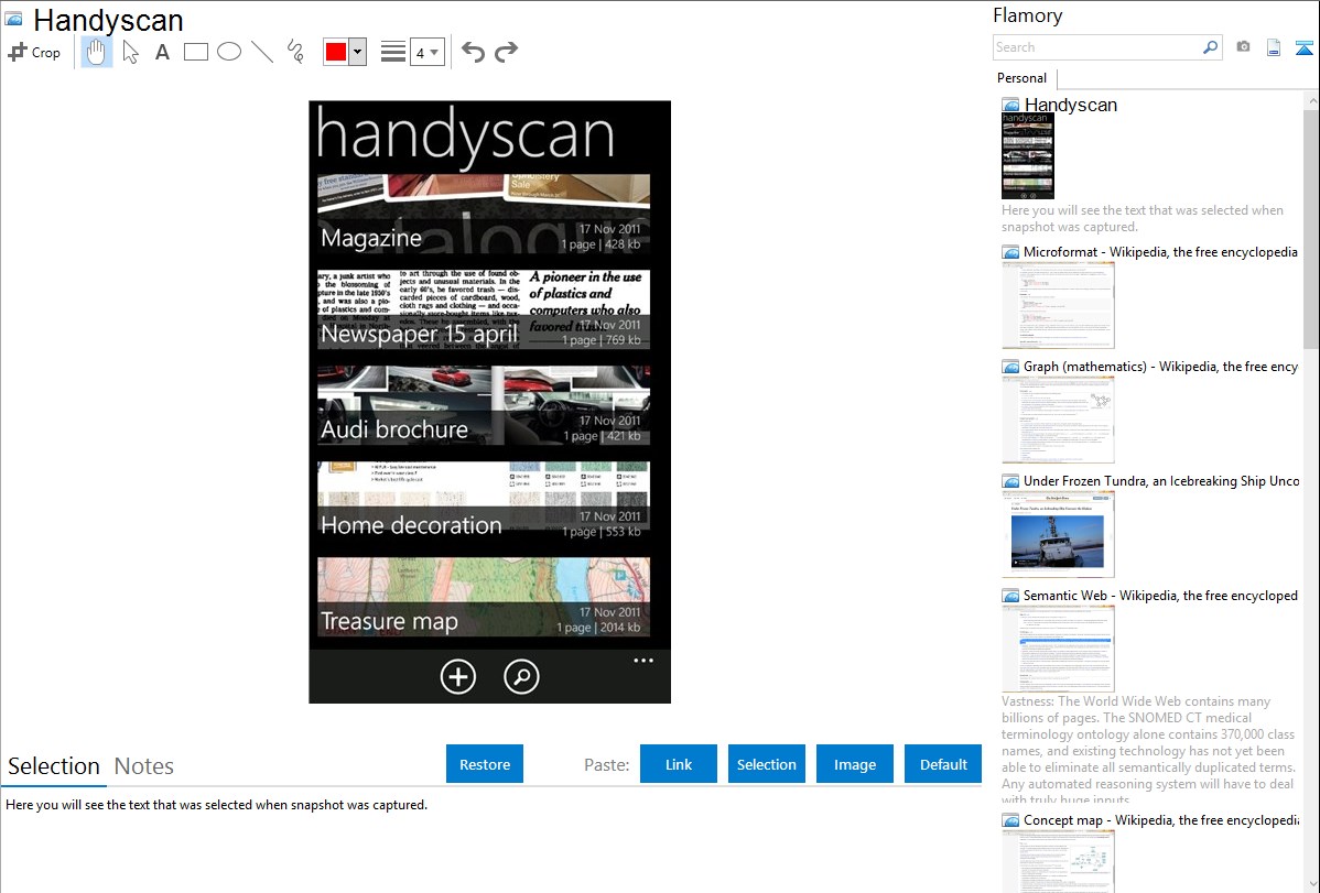 Flamory helps you capture and store screenshots from Handyscan by pressing a single hotkey. It will be saved to a history, so you can continue doing your tasks without interruptions. Later, you can edit the screenshot: crop, resize, add labels and highlights. After that, you can paste the screenshot into any other document or e-mail message.