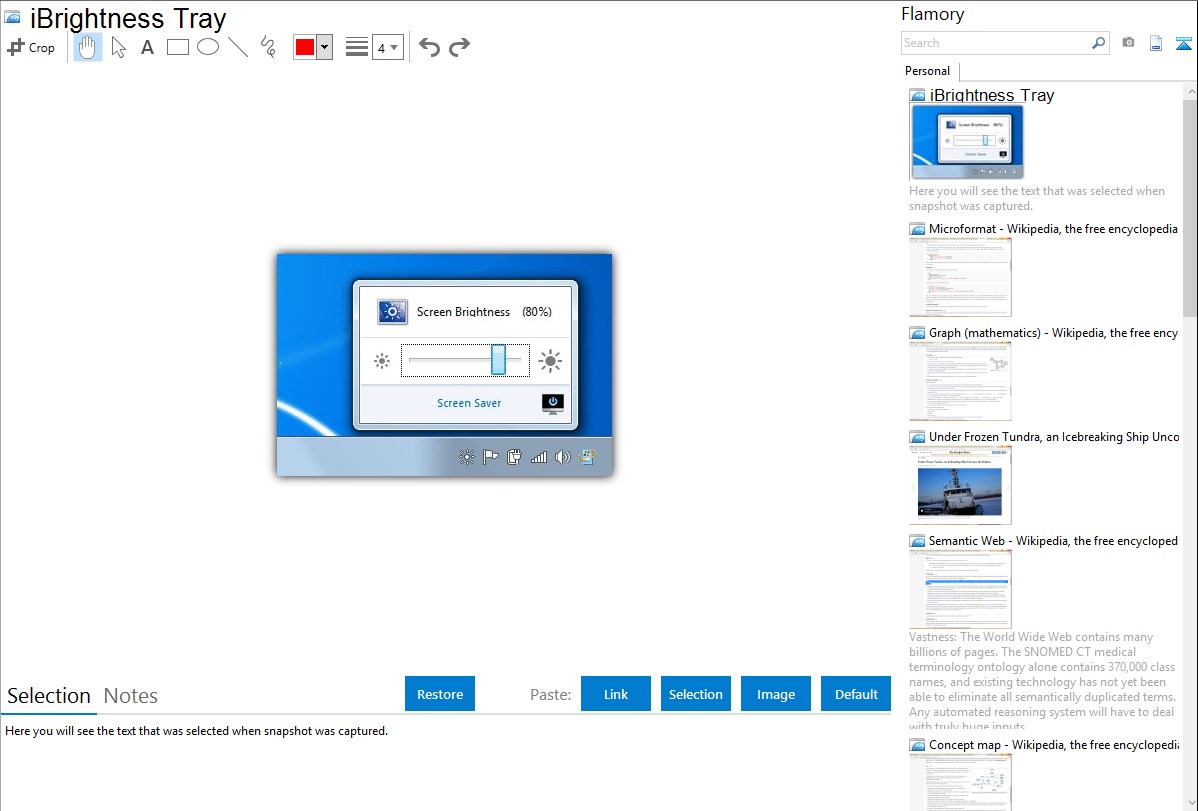 Flamory helps you capture and store screenshots from iBrightness Tray by pressing a single hotkey. It will be saved to a history, so you can continue doing your tasks without interruptions. Later, you can edit the screenshot: crop, resize, add labels and highlights. After that, you can paste the screenshot into any other document or e-mail message.