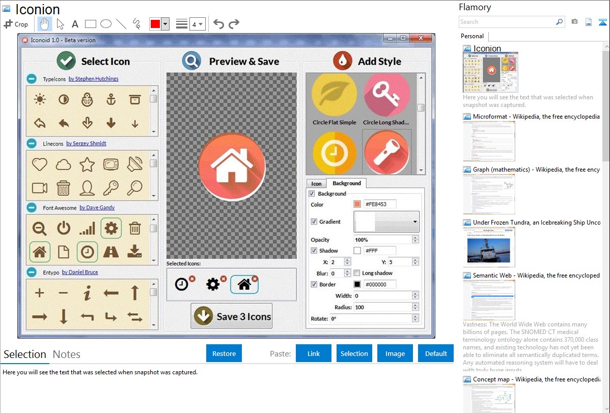 Flamory helps you capture and store screenshots from Iconion by pressing a single hotkey. It will be saved to a history, so you can continue doing your tasks without interruptions. Later, you can edit the screenshot: crop, resize, add labels and highlights. After that, you can paste the screenshot into any other document or e-mail message.