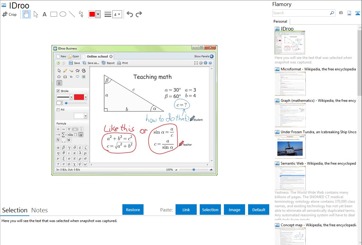 There are multiple drawing and writing tools in IDroo. You can quickly place a premade geometrical shape on the screen and add text to it, or you can easily draw any custom path or shape to explain your idea.