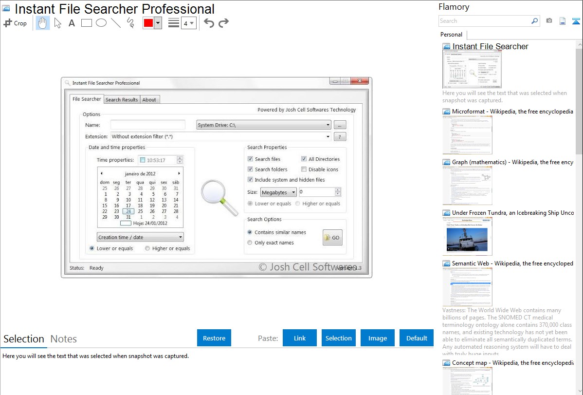 Flamory helps you capture and store screenshots from Instant File Searcher Professional by pressing a single hotkey. It will be saved to a history, so you can continue doing your tasks without interruptions. Later, you can edit the screenshot: crop, resize, add labels and highlights. After that, you can paste the screenshot into any other document or e-mail message.