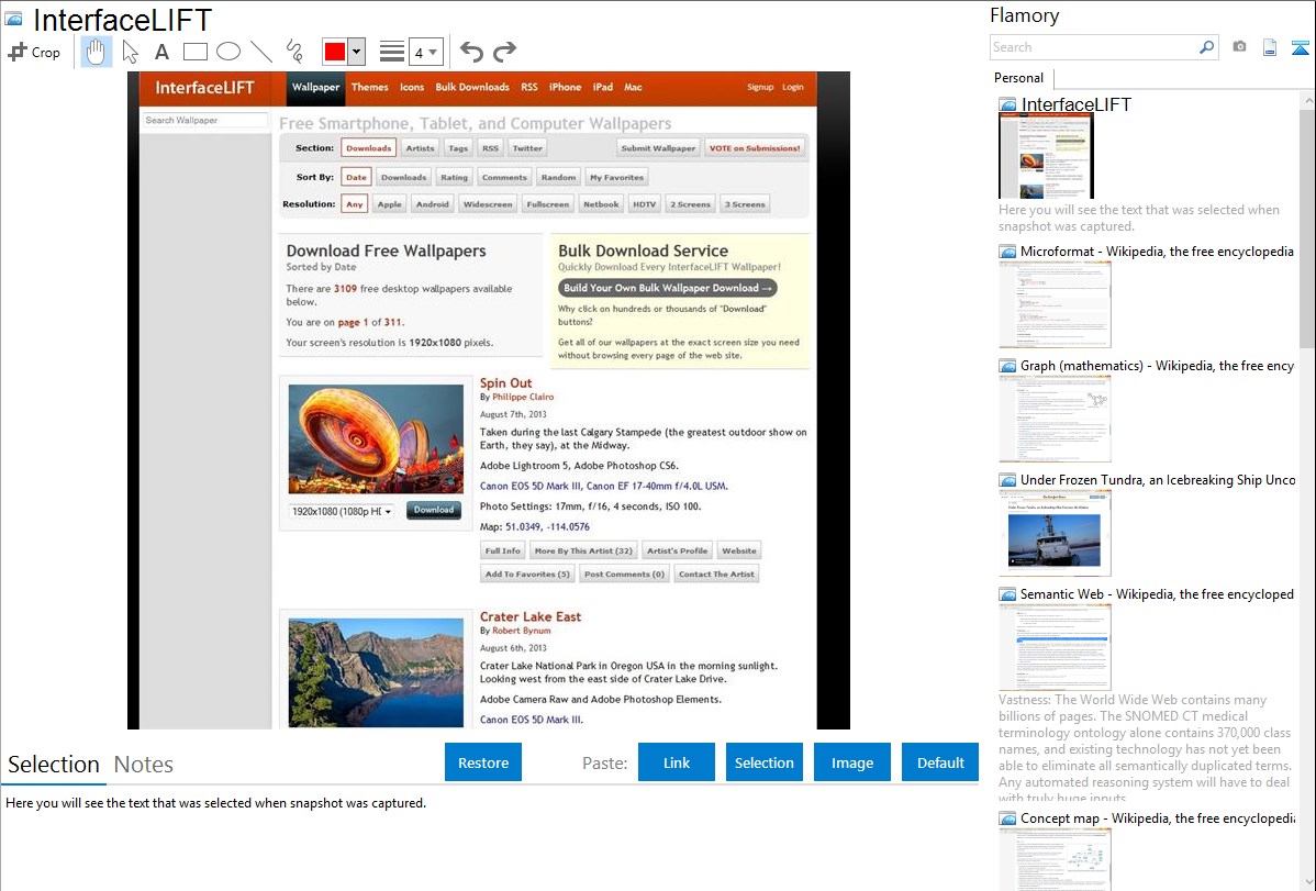 Flamory helps you capture and store screenshots from InterfaceLIFT by pressing a single hotkey. It will be saved to a history, so you can continue doing your tasks without interruptions. Later, you can edit the screenshot: crop, resize, add labels and highlights. After that, you can paste the screenshot into any other document or e-mail message.