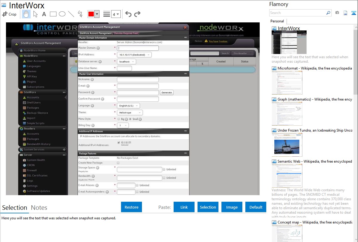 Flamory helps you capture and store screenshots from InterWorx by pressing a single hotkey. It will be saved to a history, so you can continue doing your tasks without interruptions. Later, you can edit the screenshot: crop, resize, add labels and highlights. After that, you can paste the screenshot into any other document or e-mail message.