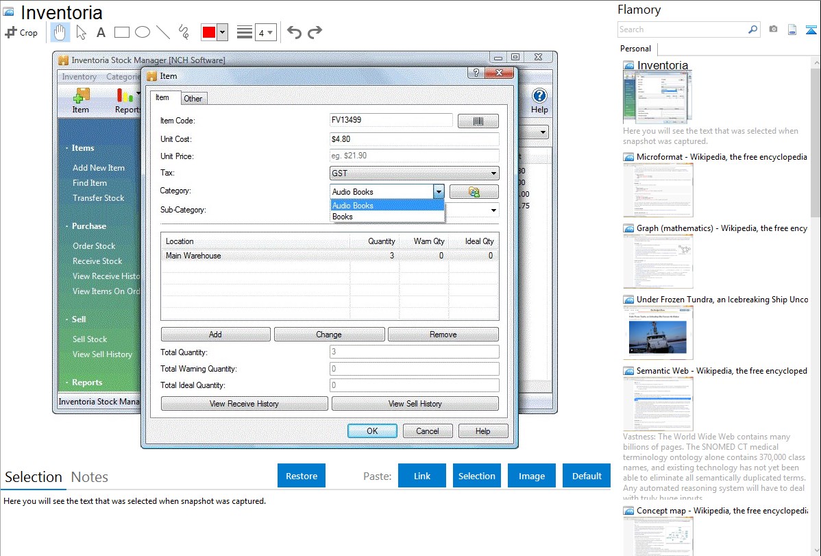 Flamory helps you capture and store screenshots from Inventoria by pressing a single hotkey. It will be saved to a history, so you can continue doing your tasks without interruptions. Later, you can edit the screenshot: crop, resize, add labels and highlights. After that, you can paste the screenshot into any other document or e-mail message.