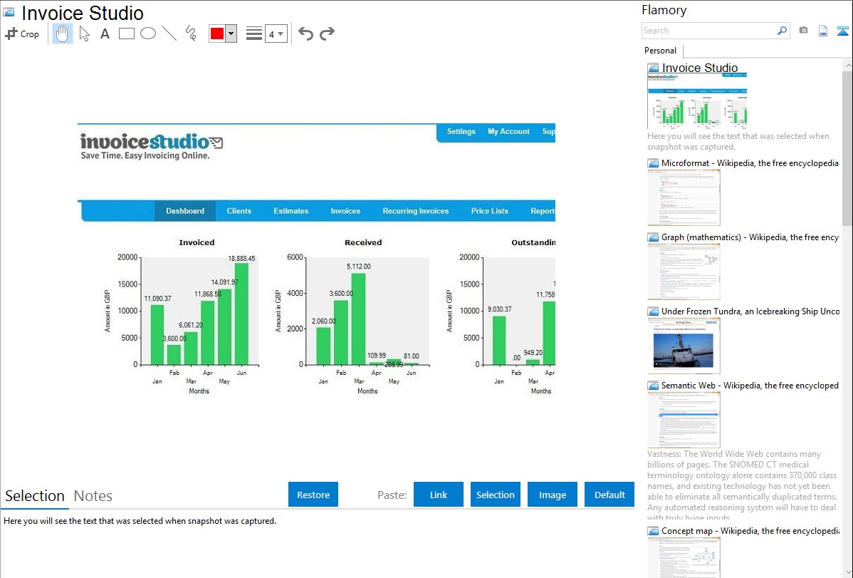 Flamory provides advanced bookmarking for Invoice Studio. It captures screen, selection, text on the page and other context. You can find this bookmark later using search by page content or looking through thumbnail list.