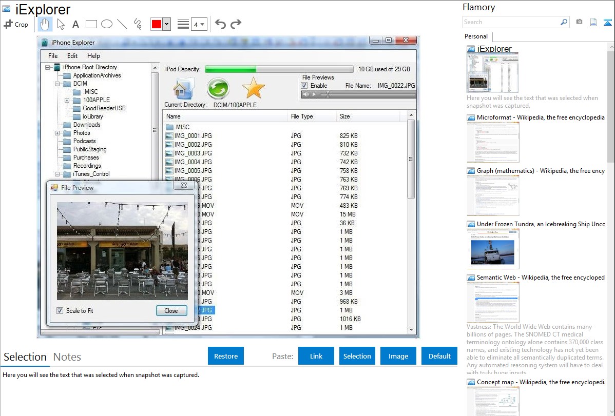 Flamory helps you capture and store screenshots from iExplorer by pressing a single hotkey. It will be saved to a history, so you can continue doing your tasks without interruptions. Later, you can edit the screenshot: crop, resize, add labels and highlights. After that, you can paste the screenshot into any other document or e-mail message.