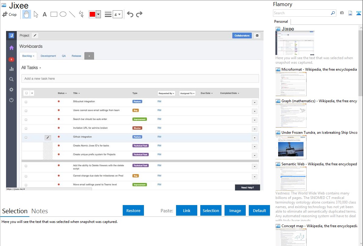 Flamory helps you capture and store screenshots from Jixee by pressing a single hotkey. It will be saved to a history, so you can continue doing your tasks without interruptions. Later, you can edit the screenshot: crop, resize, add labels and highlights. After that, you can paste the screenshot into any other document or e-mail message.