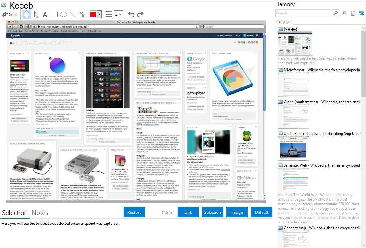 Flamory helps you capture and store screenshots from Keeeb by pressing a single hotkey. It will be saved to a history, so you can continue doing your tasks without interruptions. Later, you can edit the screenshot: crop, resize, add labels and highlights. After that, you can paste the screenshot into any other document or e-mail message.