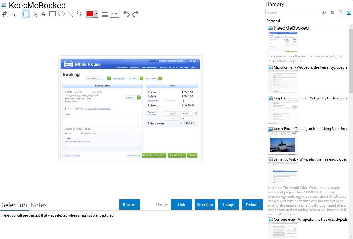 Flamory helps you capture and store screenshots from KeepMeBooked by pressing a single hotkey. It will be saved to a history, so you can continue doing your tasks without interruptions. Later, you can edit the screenshot: crop, resize, add labels and highlights. After that, you can paste the screenshot into any other document or e-mail message.