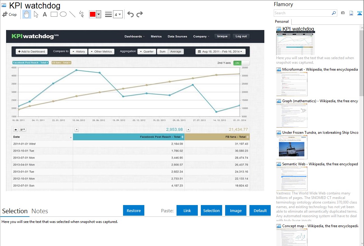 Flamory provides advanced bookmarking for KPI watchdog. It captures screen, selection, text on the page and other context. You can find this bookmark later using search by page content or looking through thumbnail list.