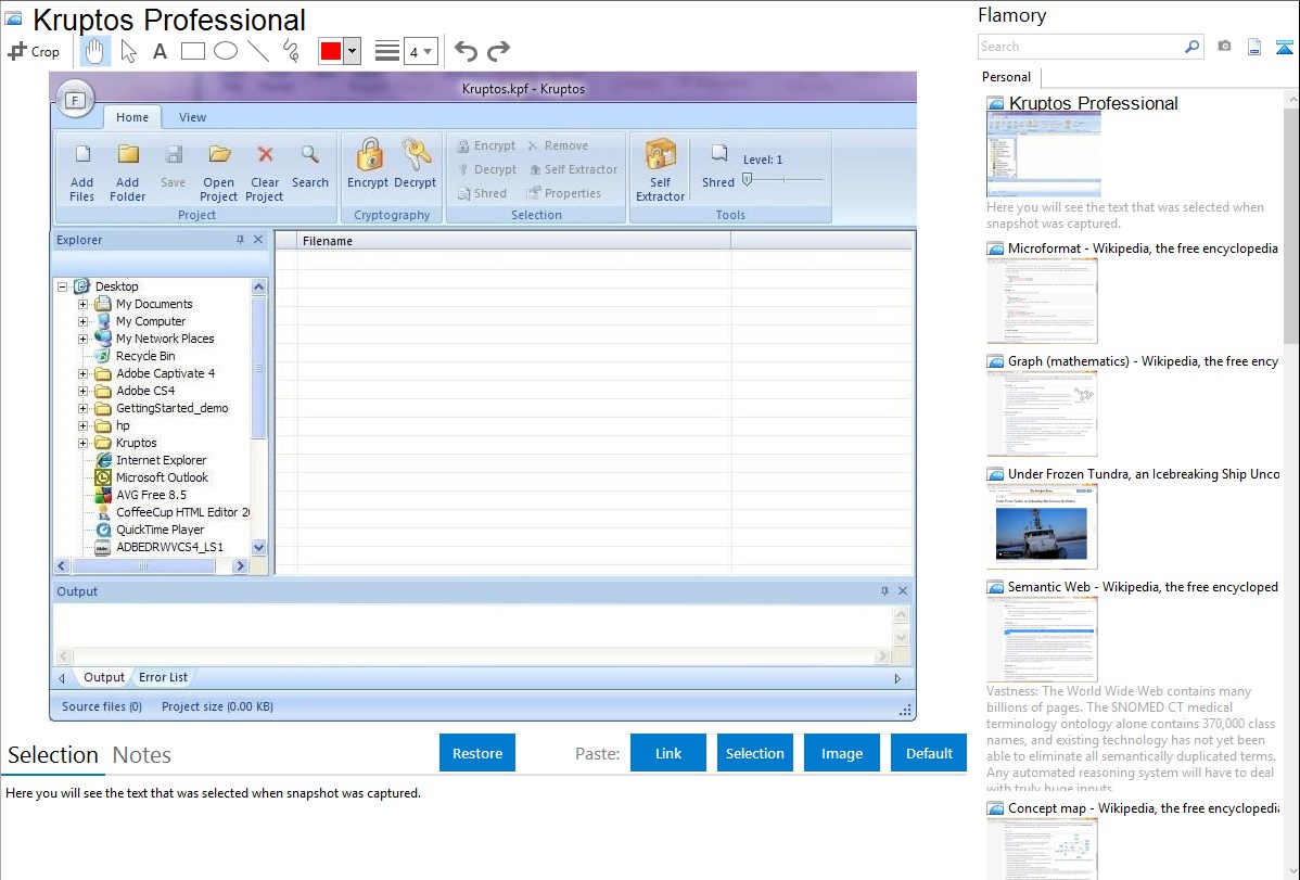 Flamory helps you capture and store screenshots from Kruptos Professional by pressing a single hotkey. It will be saved to a history, so you can continue doing your tasks without interruptions. Later, you can edit the screenshot: crop, resize, add labels and highlights. After that, you can paste the screenshot into any other document or e-mail message.