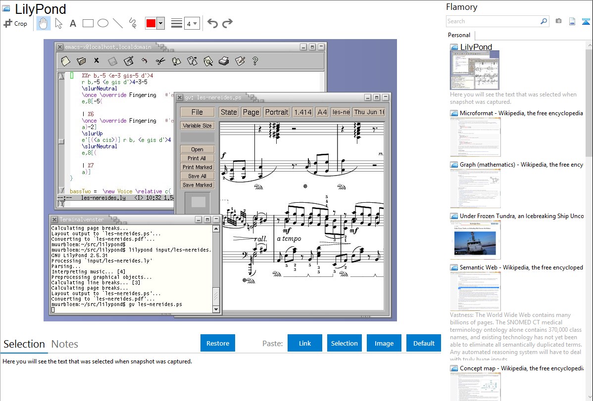 Flamory helps you capture and store screenshots from LilyPond by pressing a single hotkey. It will be saved to a history, so you can continue doing your tasks without interruptions. Later, you can edit the screenshot: crop, resize, add labels and highlights. After that, you can paste the screenshot into any other document or e-mail message.