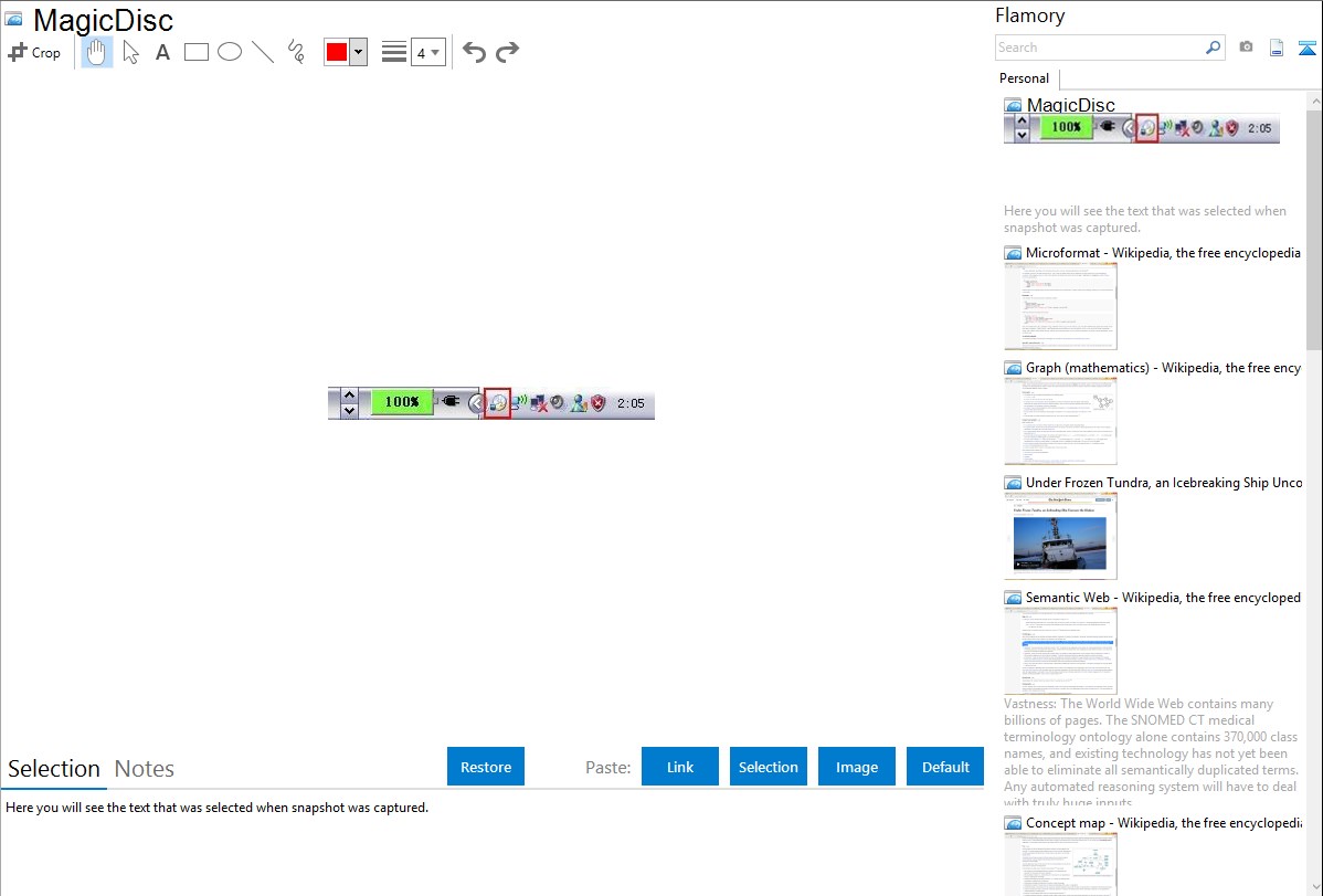 Flamory helps you capture and store screenshots from MagicDisc by pressing a single hotkey. It will be saved to a history, so you can continue doing your tasks without interruptions. Later, you can edit the screenshot: crop, resize, add labels and highlights. After that, you can paste the screenshot into any other document or e-mail message.
