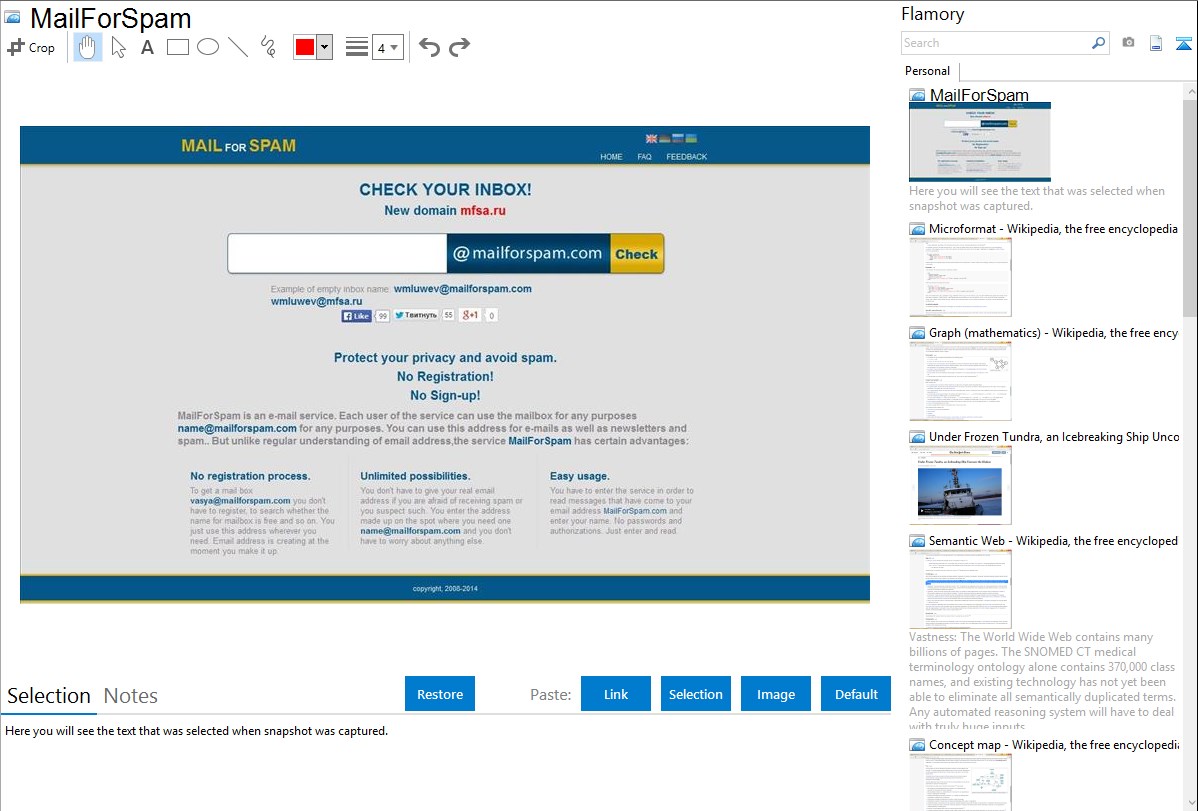 Flamory helps you capture and store screenshots from MailForSpam by pressing a single hotkey. It will be saved to a history, so you can continue doing your tasks without interruptions. Later, you can edit the screenshot: crop, resize, add labels and highlights. After that, you can paste the screenshot into any other document or e-mail message.