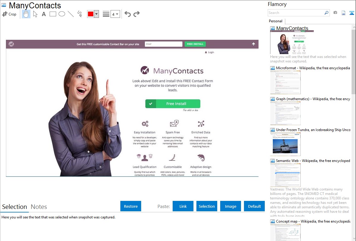 Flamory helps you capture and store screenshots from ManyContacts by pressing a single hotkey. It will be saved to a history, so you can continue doing your tasks without interruptions. Later, you can edit the screenshot: crop, resize, add labels and highlights. After that, you can paste the screenshot into any other document or e-mail message.