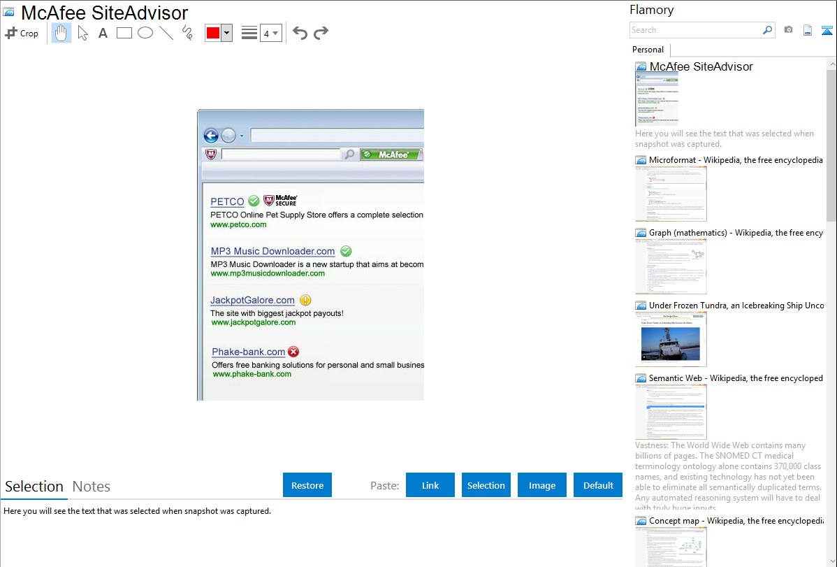 Flamory helps you capture and store screenshots from McAfee SiteAdvisor by pressing a single hotkey. It will be saved to a history, so you can continue doing your tasks without interruptions. Later, you can edit the screenshot: crop, resize, add labels and highlights. After that, you can paste the screenshot into any other document or e-mail message.