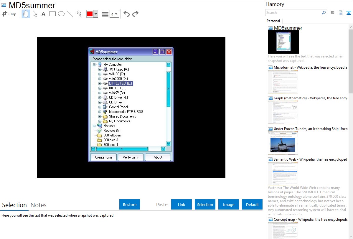 Flamory helps you capture and store screenshots from MD5summer by pressing a single hotkey. It will be saved to a history, so you can continue doing your tasks without interruptions. Later, you can edit the screenshot: crop, resize, add labels and highlights. After that, you can paste the screenshot into any other document or e-mail message.