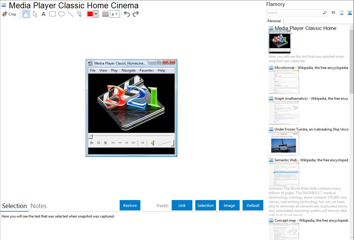 Flamory helps you capture and store screenshots from Media Player Classic Home Cinema by pressing a single hotkey. It will be saved to a history, so you can continue doing your tasks without interruptions. Later, you can edit the screenshot: crop, resize, add labels and highlights. After that, you can paste the screenshot into any other document or e-mail message.
