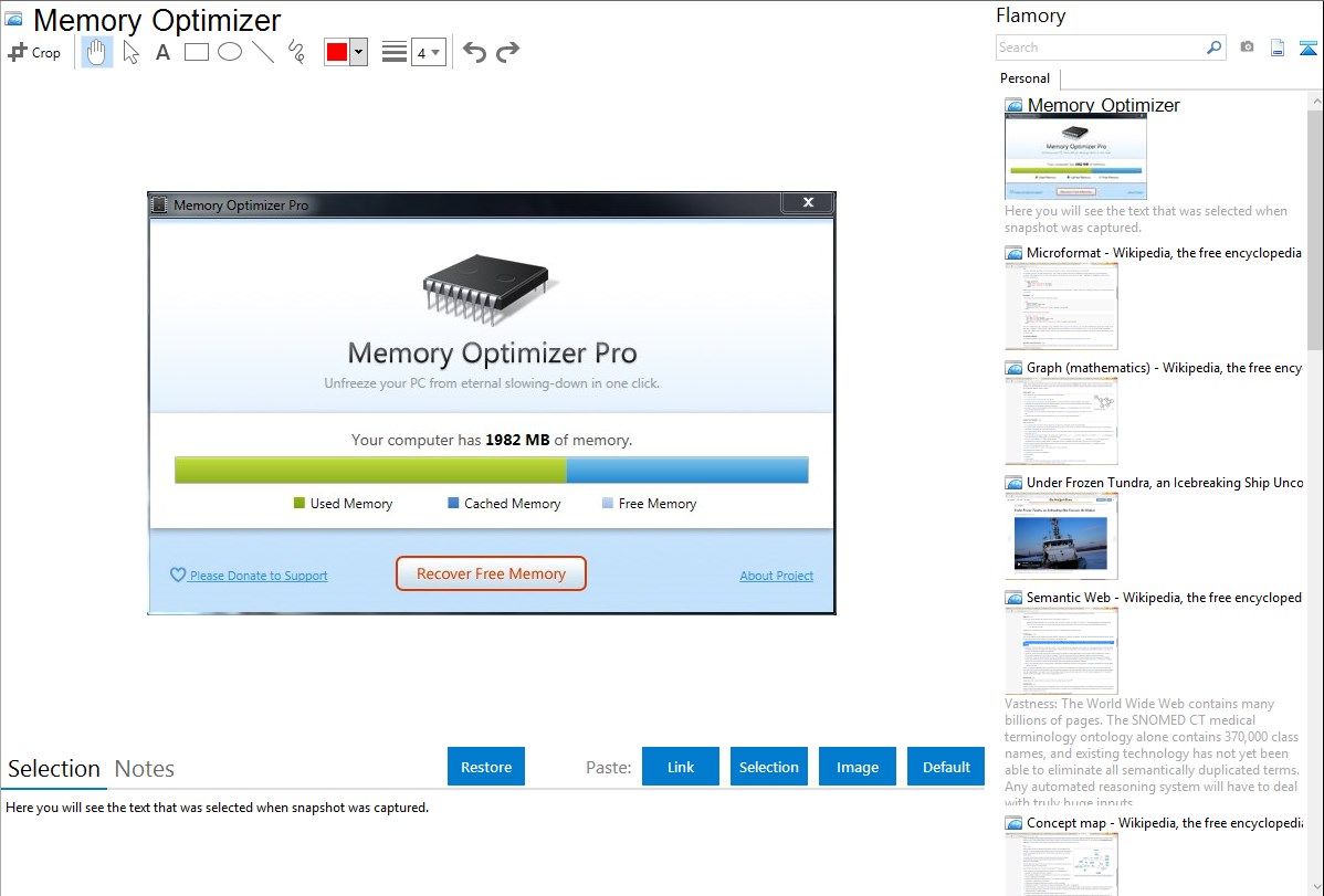 Flamory helps you capture and store screenshots from Memory Optimizer by pressing a single hotkey. It will be saved to a history, so you can continue doing your tasks without interruptions. Later, you can edit the screenshot: crop, resize, add labels and highlights. After that, you can paste the screenshot into any other document or e-mail message.