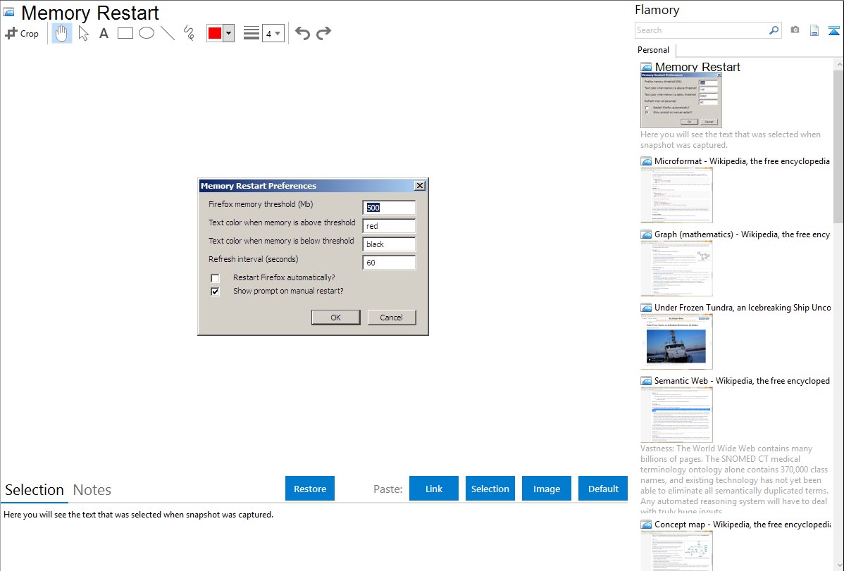 Flamory helps you capture and store screenshots from Memory Restart by pressing a single hotkey. It will be saved to a history, so you can continue doing your tasks without interruptions. Later, you can edit the screenshot: crop, resize, add labels and highlights. After that, you can paste the screenshot into any other document or e-mail message.