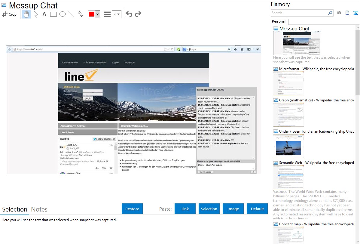 Flamory helps you capture and store screenshots from Messup Chat by pressing a single hotkey. It will be saved to a history, so you can continue doing your tasks without interruptions. Later, you can edit the screenshot: crop, resize, add labels and highlights. After that, you can paste the screenshot into any other document or e-mail message.