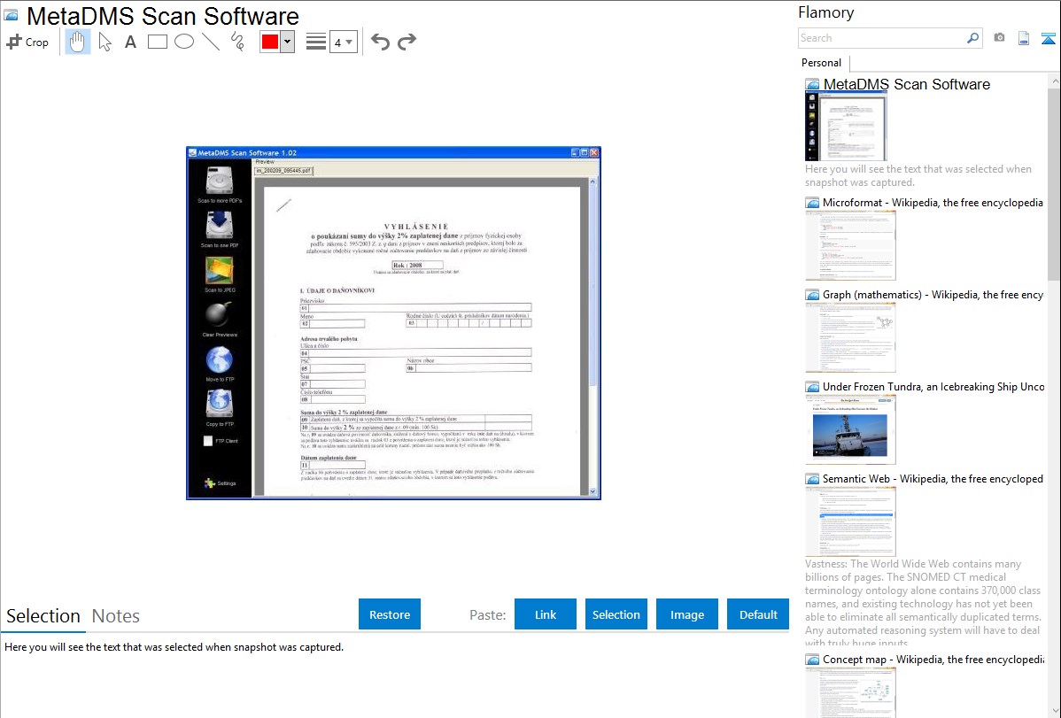 Flamory helps you capture and store screenshots from MetaDMS Scan Software by pressing a single hotkey. It will be saved to a history, so you can continue doing your tasks without interruptions. Later, you can edit the screenshot: crop, resize, add labels and highlights. After that, you can paste the screenshot into any other document or e-mail message.
