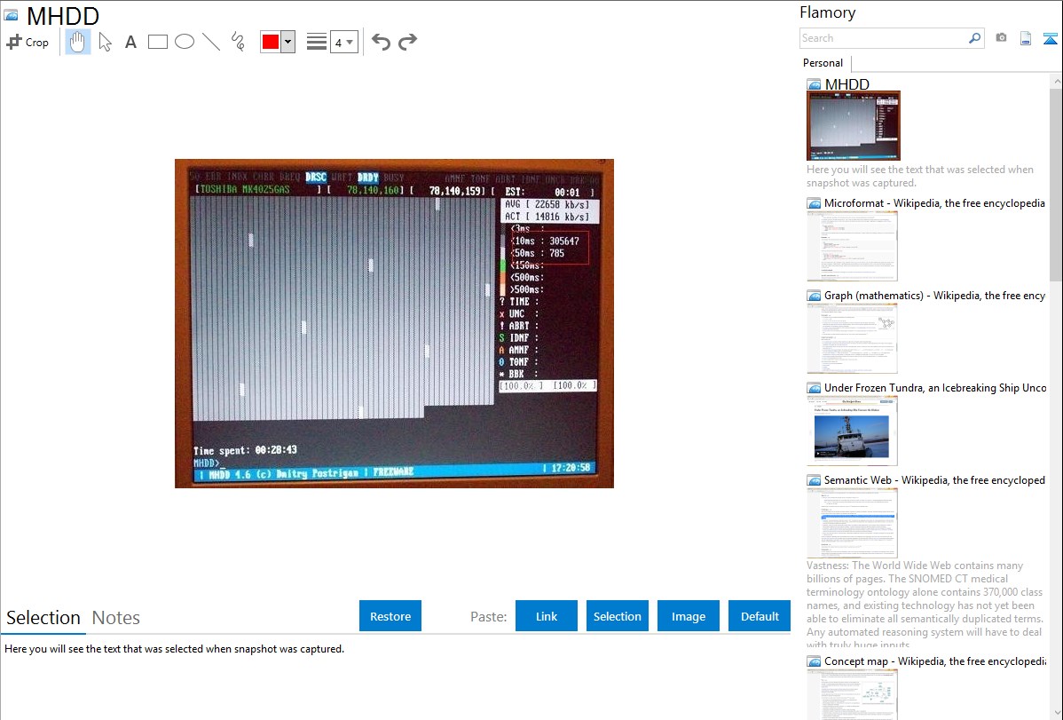 Flamory helps you capture and store screenshots from MHDD by pressing a single hotkey. It will be saved to a history, so you can continue doing your tasks without interruptions. Later, you can edit the screenshot: crop, resize, add labels and highlights. After that, you can paste the screenshot into any other document or e-mail message.