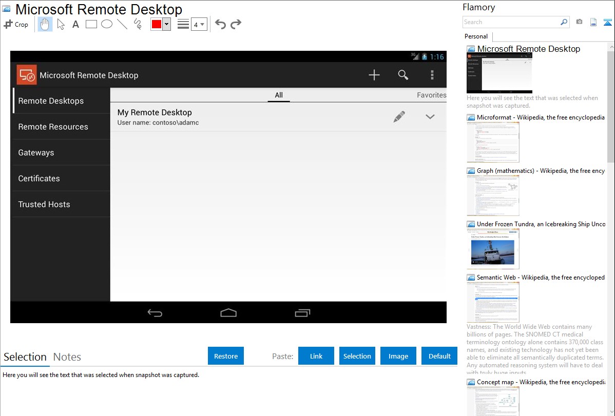 Flamory helps you capture and store screenshots from Microsoft Remote Desktop by pressing a single hotkey. It will be saved to a history, so you can continue doing your tasks without interruptions. Later, you can edit the screenshot: crop, resize, add labels and highlights. After that, you can paste the screenshot into any other document or e-mail message.
