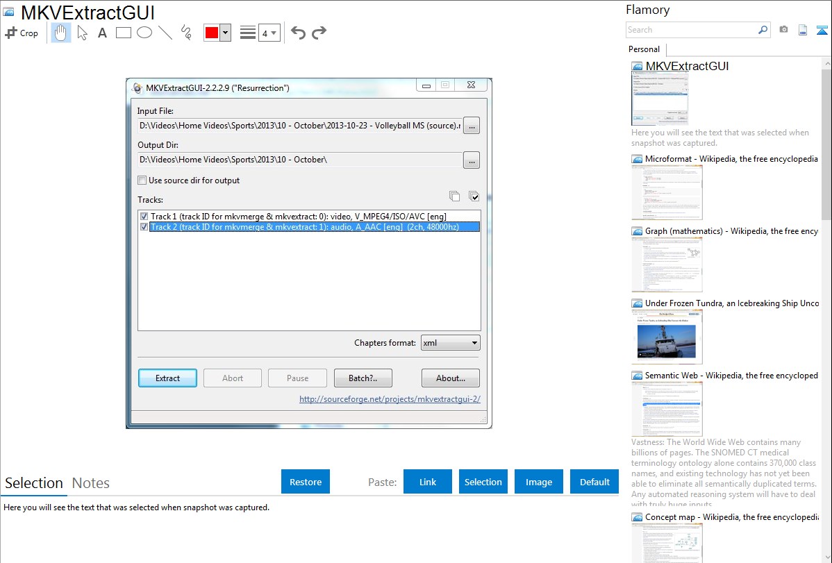 Flamory provides advanced bookmarking for MKVExtractGUI. It captures screen, selection, text of the document and other context. You can find this bookmark later using search by document content or looking through thumbnail list.