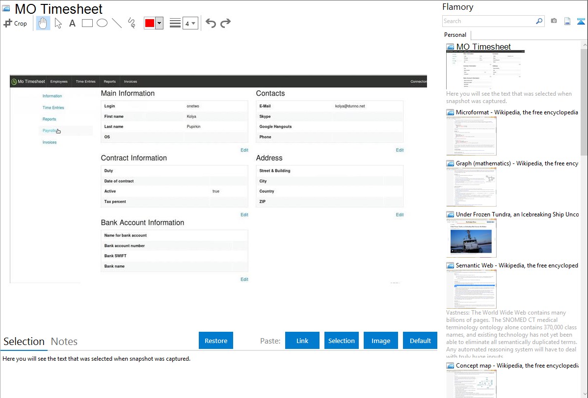Flamory helps you capture and store screenshots from MO Timesheet by pressing a single hotkey. It will be saved to a history, so you can continue doing your tasks without interruptions. Later, you can edit the screenshot: crop, resize, add labels and highlights. After that, you can paste the screenshot into any other document or e-mail message.