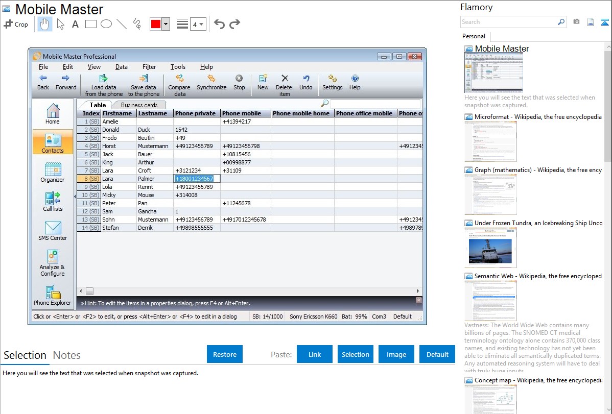 Flamory helps you capture and store screenshots from Mobile Master by pressing a single hotkey. It will be saved to a history, so you can continue doing your tasks without interruptions. Later, you can edit the screenshot: crop, resize, add labels and highlights. After that, you can paste the screenshot into any other document or e-mail message.