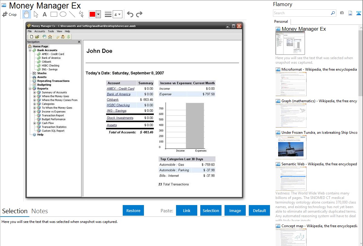 Flamory helps you capture and store screenshots from Money Manager Ex by pressing a single hotkey. It will be saved to a history, so you can continue doing your tasks without interruptions. Later, you can edit the screenshot: crop, resize, add labels and highlights. After that, you can paste the screenshot into any other document or e-mail message.