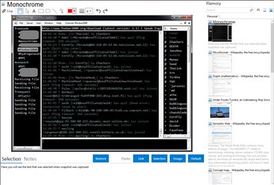 Monochrome is an IRC client intended for long-time IRC users. Its primary goals are security, reliability and stability despite of IRC network failures or connectivity problems.