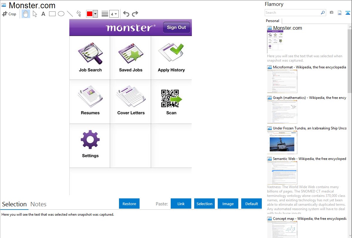 Flamory helps you capture and store screenshots from Monster.com by pressing a single hotkey. It will be saved to a history, so you can continue doing your tasks without interruptions. Later, you can edit the screenshot: crop, resize, add labels and highlights. After that, you can paste the screenshot into any other document or e-mail message.