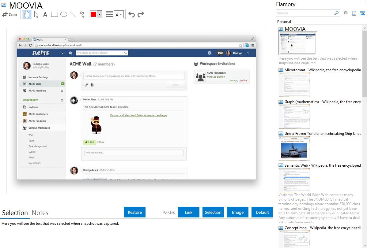 Flamory helps you capture and store screenshots from MOOVIA by pressing a single hotkey. It will be saved to a history, so you can continue doing your tasks without interruptions. Later, you can edit the screenshot: crop, resize, add labels and highlights. After that, you can paste the screenshot into any other document or e-mail message.