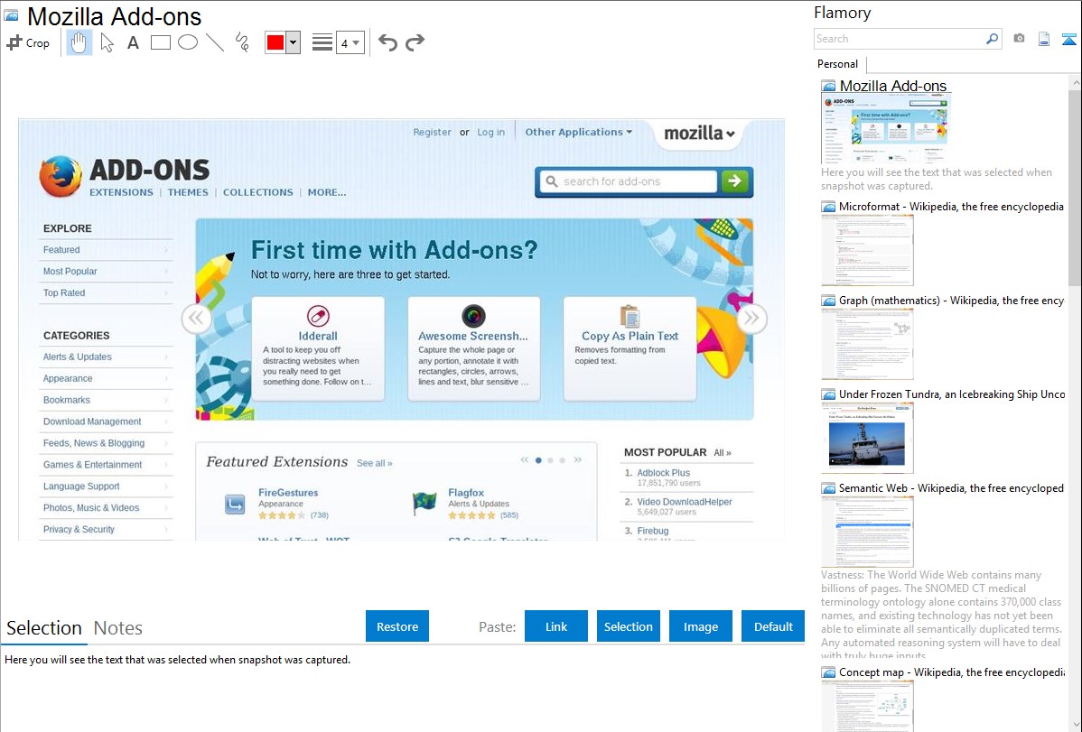 Flamory helps you capture and store screenshots from Mozilla Add-ons by pressing a single hotkey. It will be saved to a history, so you can continue doing your tasks without interruptions. Later, you can edit the screenshot: crop, resize, add labels and highlights. After that, you can paste the screenshot into any other document or e-mail message.