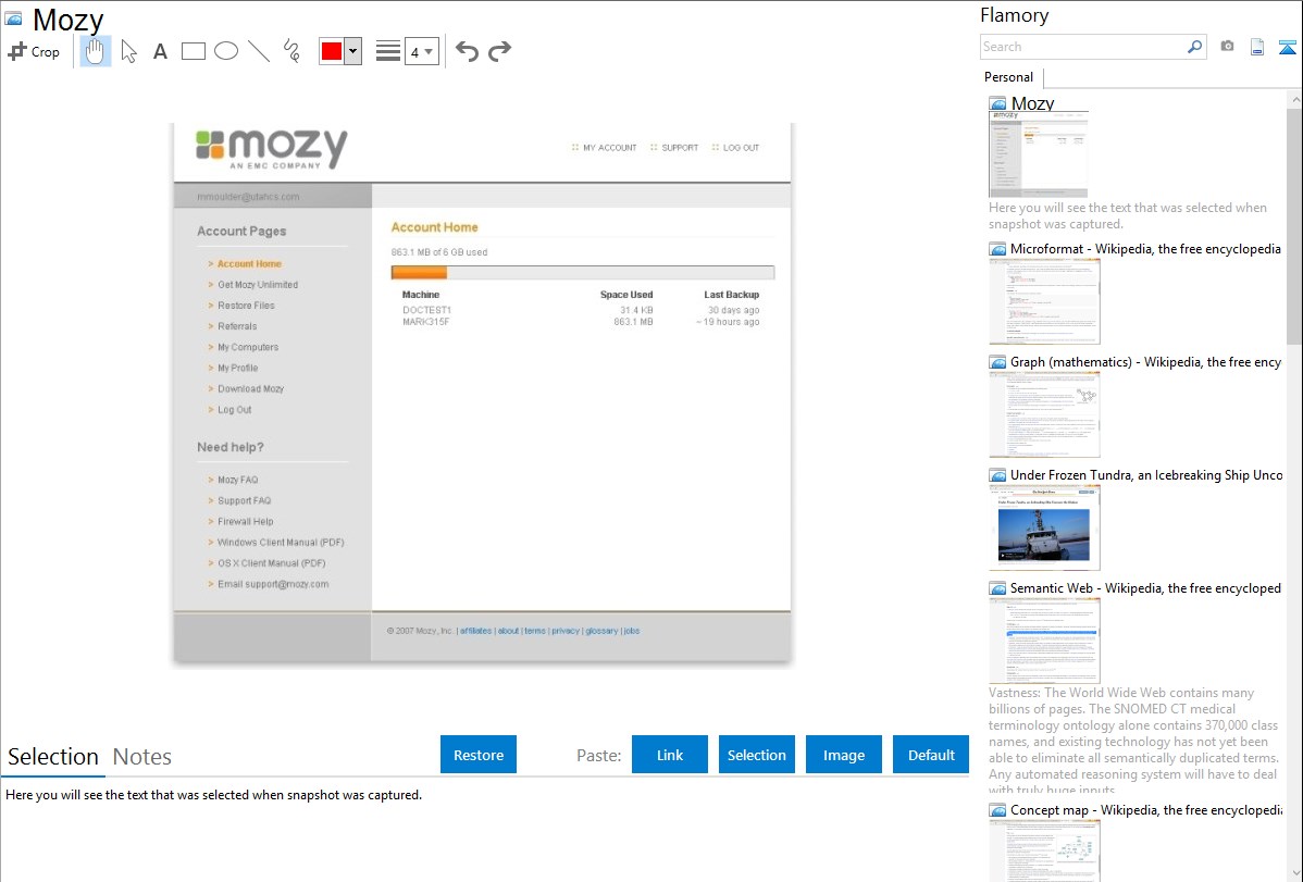 Flamory helps you capture and store screenshots from Mozy by pressing a single hotkey. It will be saved to a history, so you can continue doing your tasks without interruptions. Later, you can edit the screenshot: crop, resize, add labels and highlights. After that, you can paste the screenshot into any other document or e-mail message.