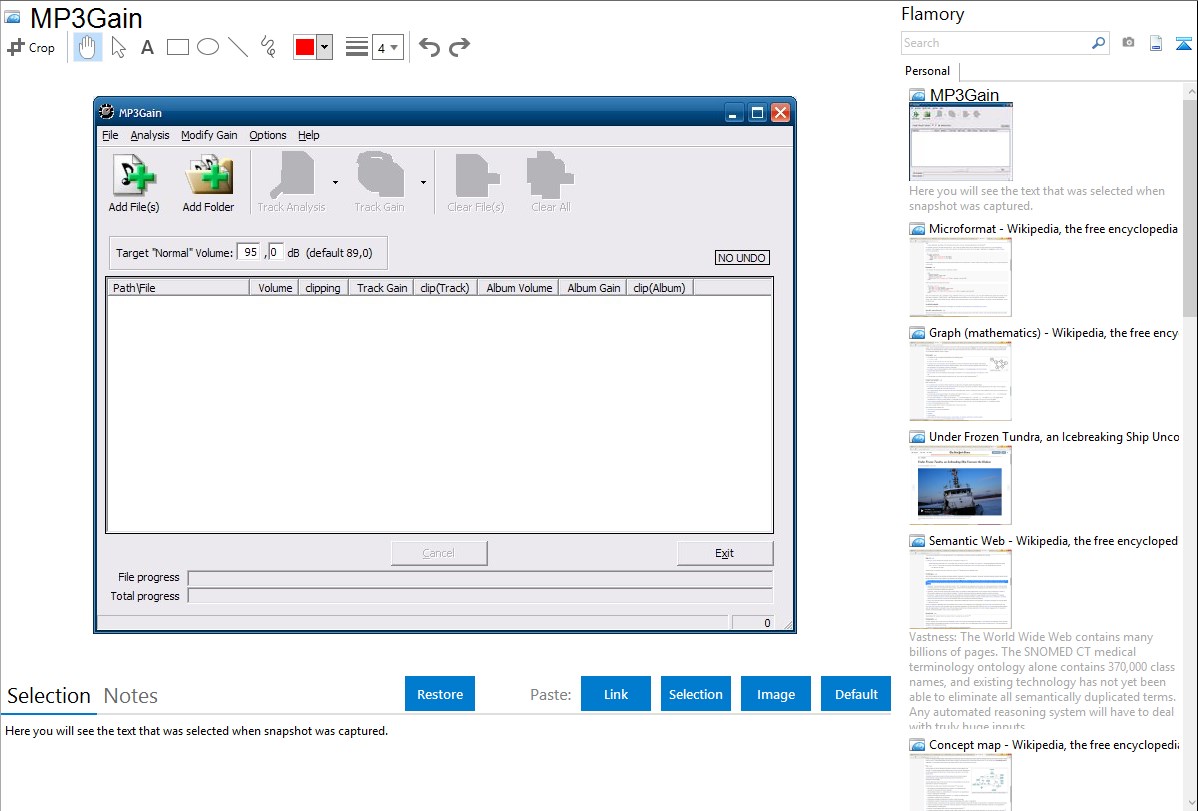 Flamory helps you capture and store screenshots from MP3Gain by pressing a single hotkey. It will be saved to a history, so you can continue doing your tasks without interruptions. Later, you can edit the screenshot: crop, resize, add labels and highlights. After that, you can paste the screenshot into any other document or e-mail message.