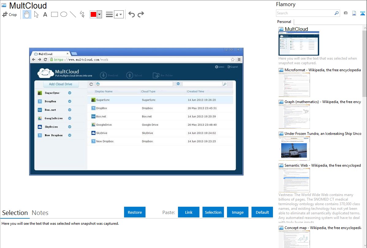 Flamory helps you capture and store screenshots from MultCloud by pressing a single hotkey. It will be saved to a history, so you can continue doing your tasks without interruptions. Later, you can edit the screenshot: crop, resize, add labels and highlights. After that, you can paste the screenshot into any other document or e-mail message.