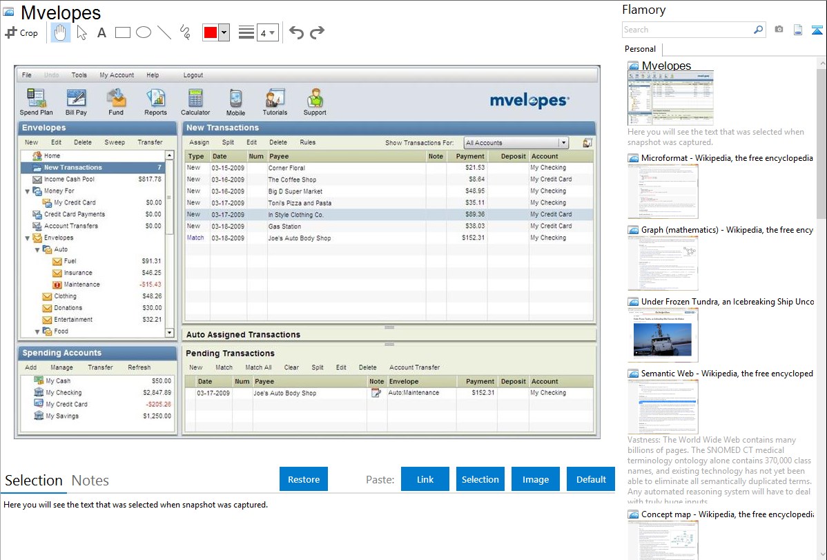 Flamory helps you capture and store screenshots from Mvelopes by pressing a single hotkey. It will be saved to a history, so you can continue doing your tasks without interruptions. Later, you can edit the screenshot: crop, resize, add labels and highlights. After that, you can paste the screenshot into any other document or e-mail message.