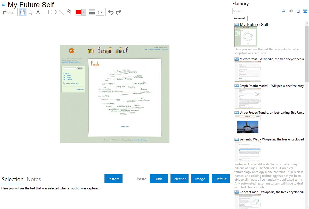 Flamory helps you capture and store screenshots from My Future Self by pressing a single hotkey. It will be saved to a history, so you can continue doing your tasks without interruptions. Later, you can edit the screenshot: crop, resize, add labels and highlights. After that, you can paste the screenshot into any other document or e-mail message.