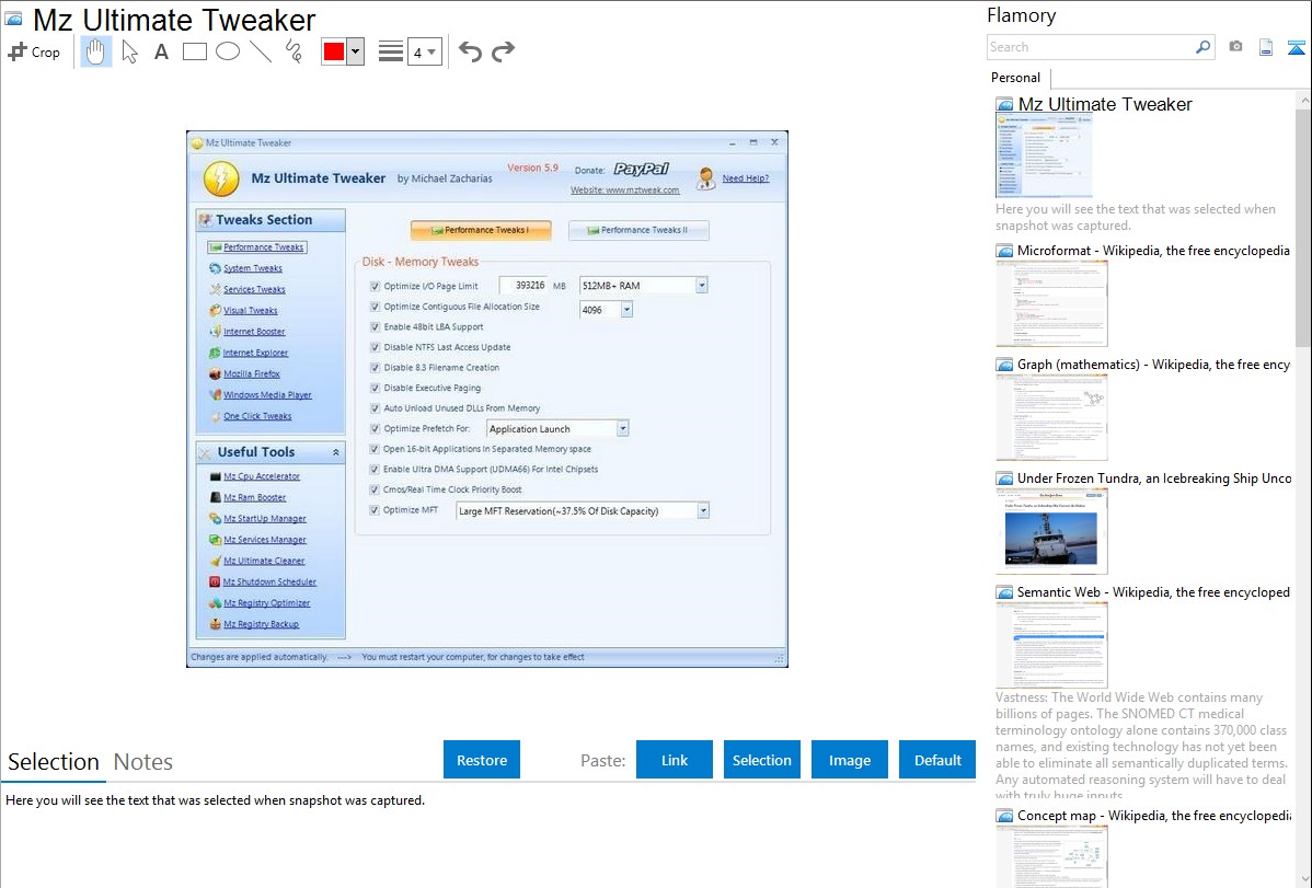 Flamory helps you capture and store screenshots from Mz Ultimate Tweaker by pressing a single hotkey. It will be saved to a history, so you can continue doing your tasks without interruptions. Later, you can edit the screenshot: crop, resize, add labels and highlights. After that, you can paste the screenshot into any other document or e-mail message.