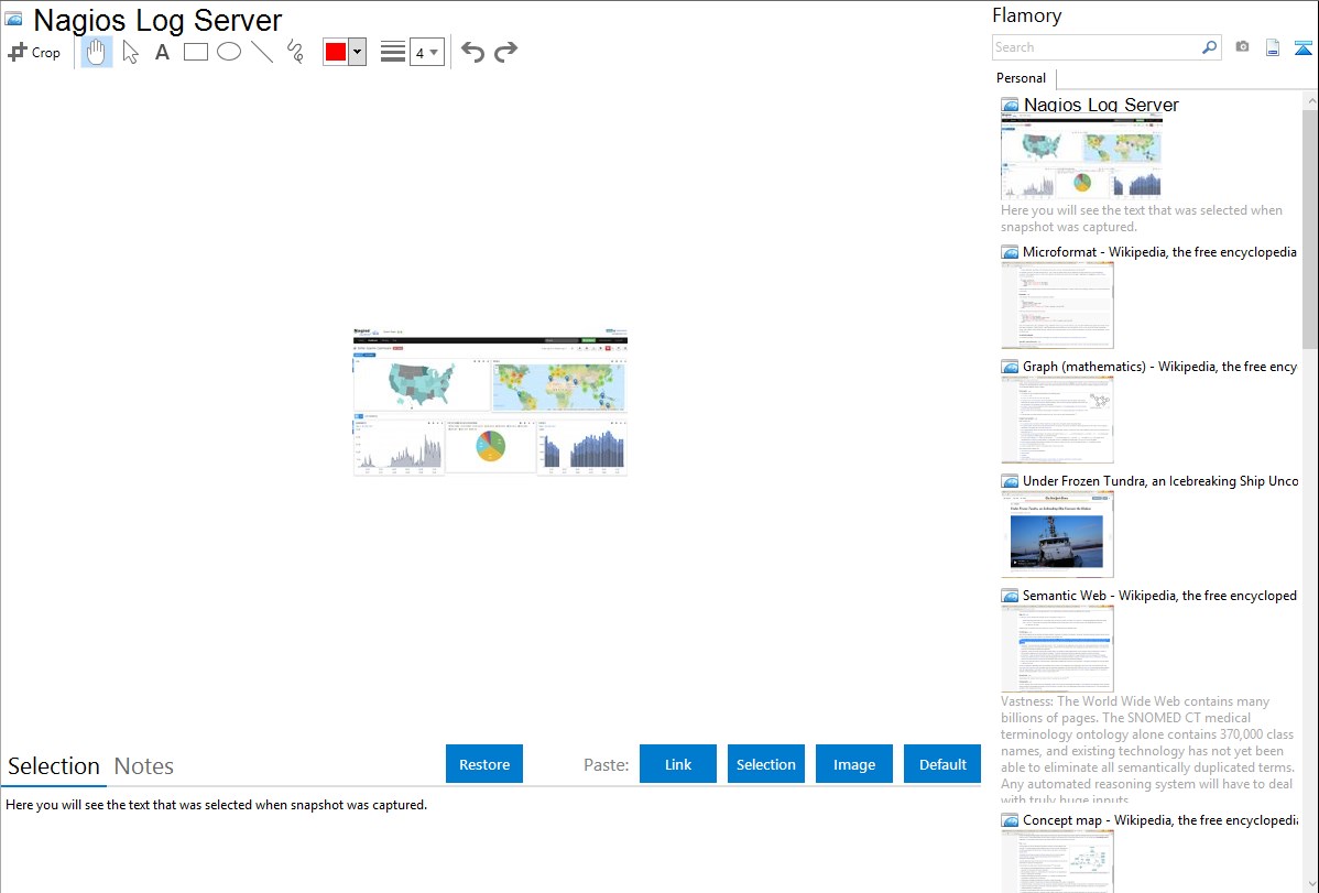 Flamory helps you capture and store screenshots from Nagios Log Server by pressing a single hotkey. It will be saved to a history, so you can continue doing your tasks without interruptions. Later, you can edit the screenshot: crop, resize, add labels and highlights. After that, you can paste the screenshot into any other document or e-mail message.
