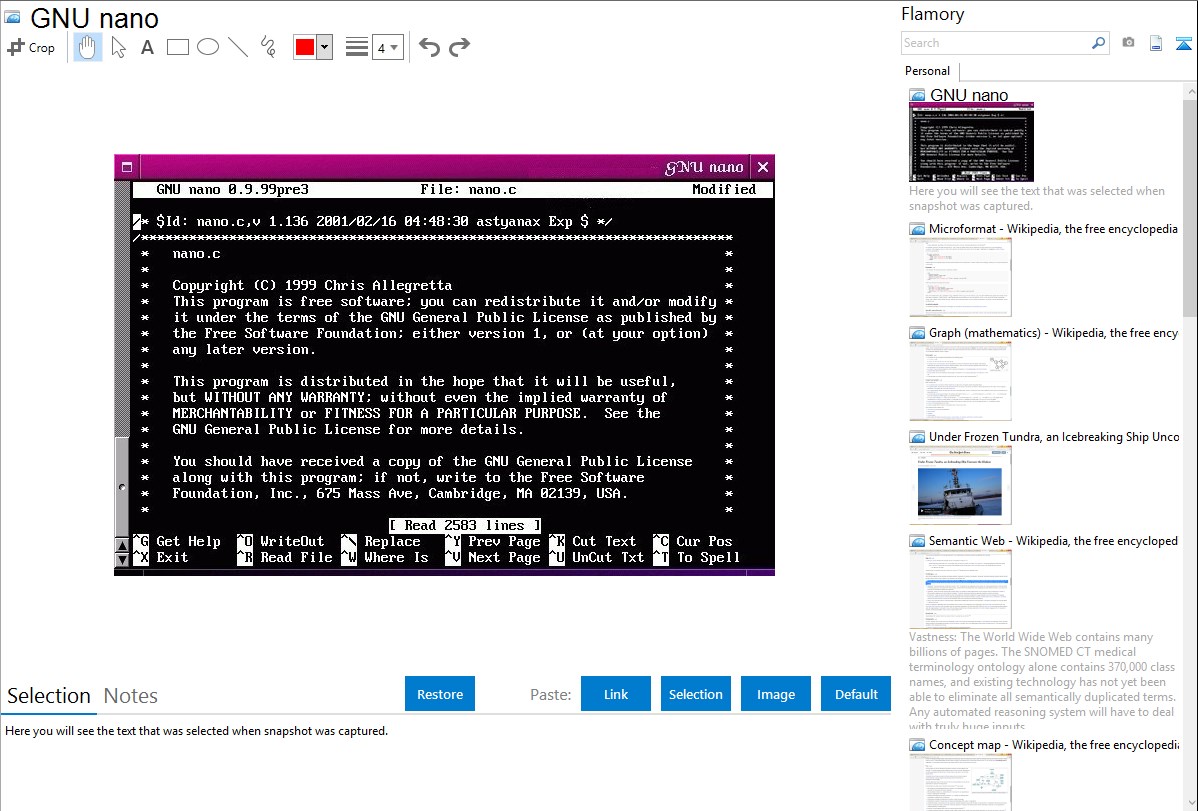 Flamory helps you capture and store screenshots from GNU nano by pressing a single hotkey. It will be saved to a history, so you can continue doing your tasks without interruptions. Later, you can edit the screenshot: crop, resize, add labels and highlights. After that, you can paste the screenshot into any other document or e-mail message.