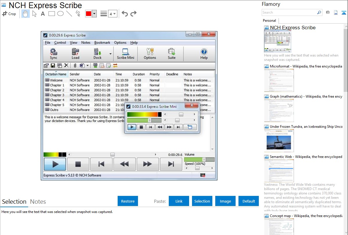 Flamory helps you capture and store screenshots from NCH Express Scribe by pressing a single hotkey. It will be saved to a history, so you can continue doing your tasks without interruptions. Later, you can edit the screenshot: crop, resize, add labels and highlights. After that, you can paste the screenshot into any other document or e-mail message.