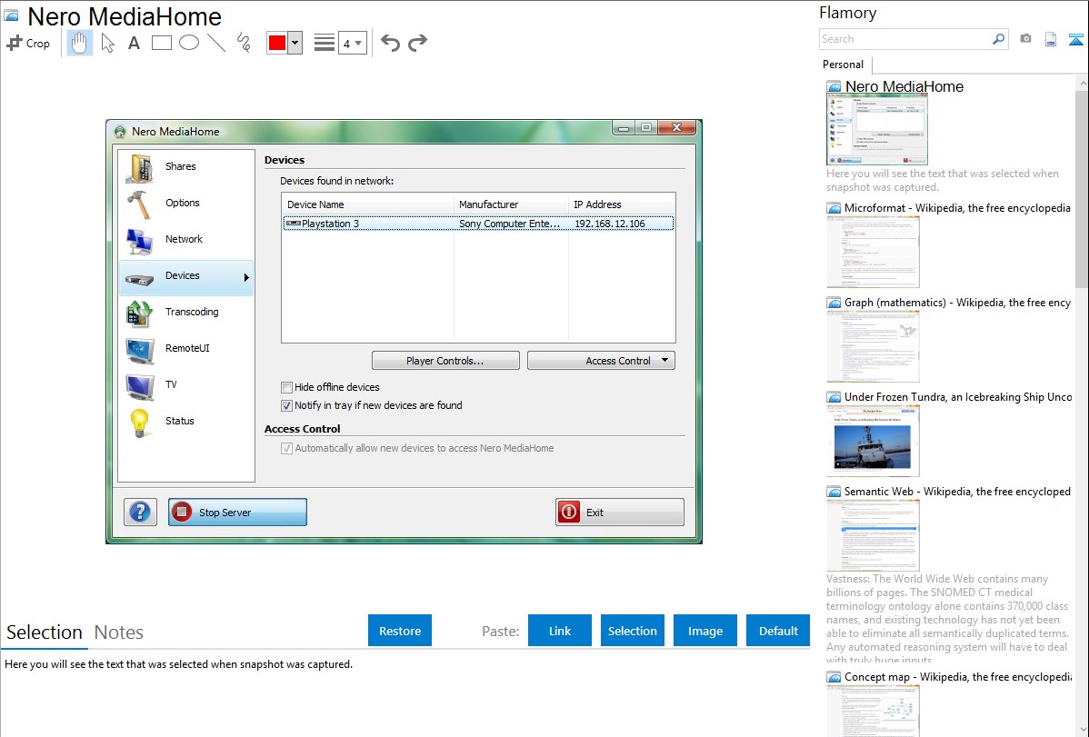 Flamory helps you capture and store screenshots from Nero MediaHome by pressing a single hotkey. It will be saved to a history, so you can continue doing your tasks without interruptions. Later, you can edit the screenshot: crop, resize, add labels and highlights. After that, you can paste the screenshot into any other document or e-mail message.