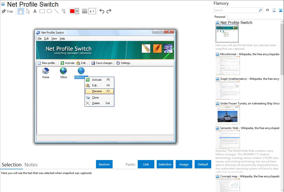 Flamory helps you capture and store screenshots from Net Profile Switch by pressing a single hotkey. It will be saved to a history, so you can continue doing your tasks without interruptions. Later, you can edit the screenshot: crop, resize, add labels and highlights. After that, you can paste the screenshot into any other document or e-mail message.