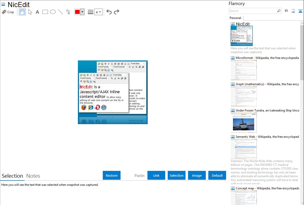 Flamory helps you capture and store screenshots from NicEdit by pressing a single hotkey. It will be saved to a history, so you can continue doing your tasks without interruptions. Later, you can edit the screenshot: crop, resize, add labels and highlights. After that, you can paste the screenshot into any other document or e-mail message.